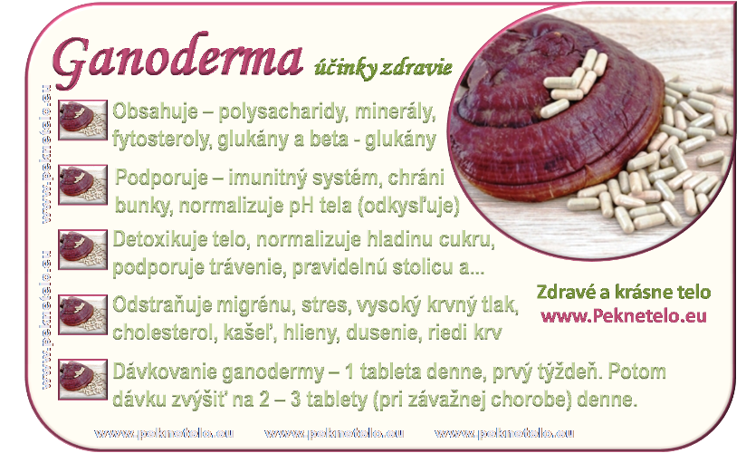 Ganoderma je produktom z hlavnej prísady huby reishi. Určite ste už o tejto hube počuli. Ganoderma sú výťažky z huby reishi v tej najčistejšej forme v tabletovej forme. Tento produkt prináša zdraviu skutočnú pohodu a zlepšenie zdravotného stavu. Látky, ktoré huba reishi a tým aj tento výsledný produkt obsahujú, je v skutku úžasný! Presvedčte sa sami aké pozitíva má ganoderma a možno si ju kúpite aj Vy…